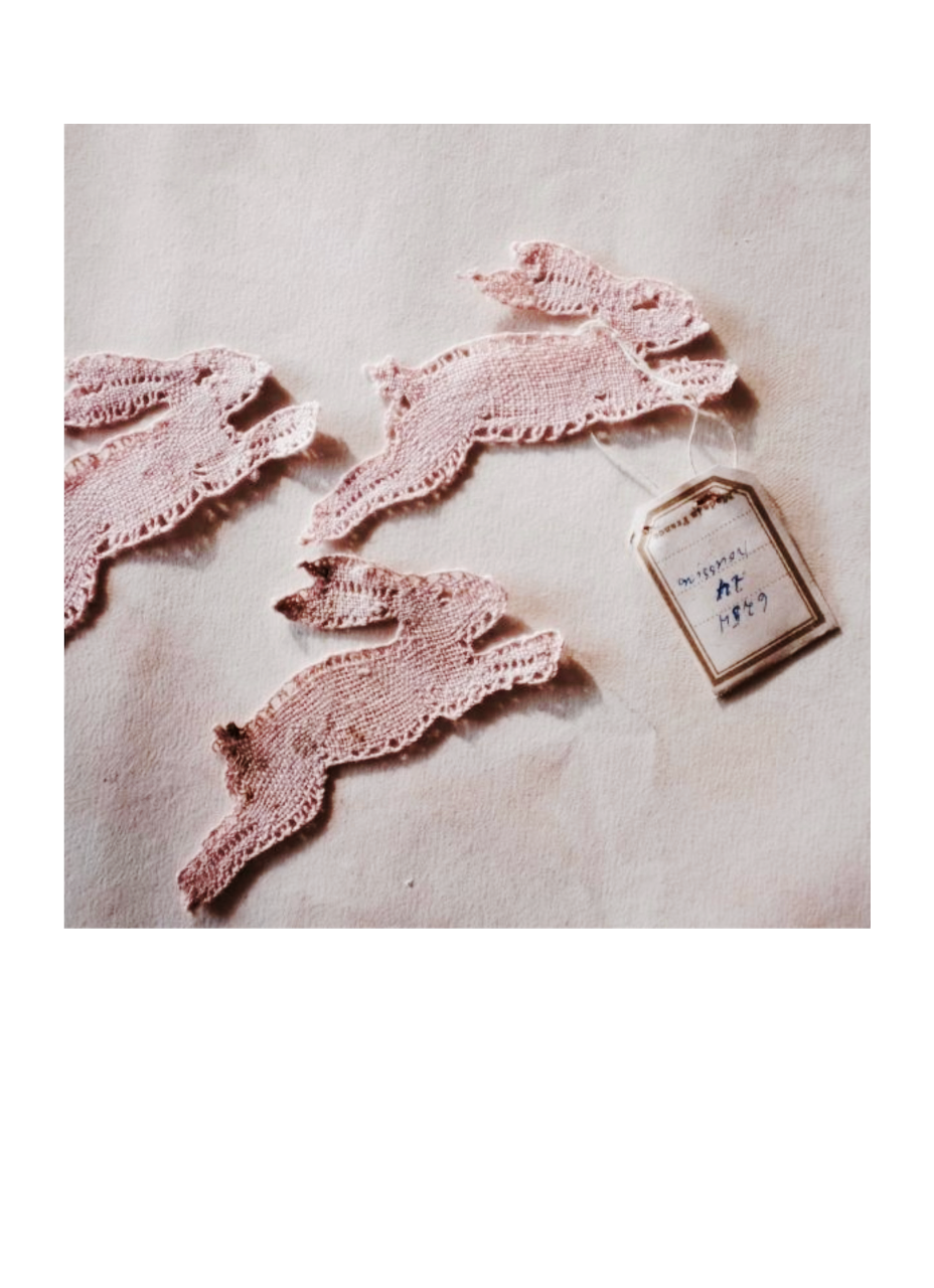 フランス 1930s リネン 古薔薇色のウサギとボビンレースアップリケ 2p アンティーク