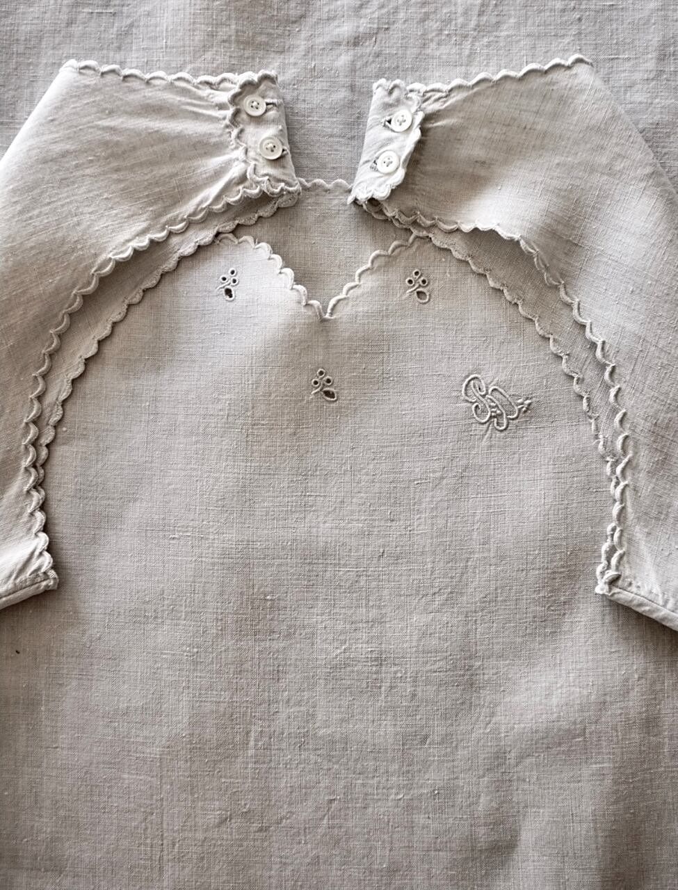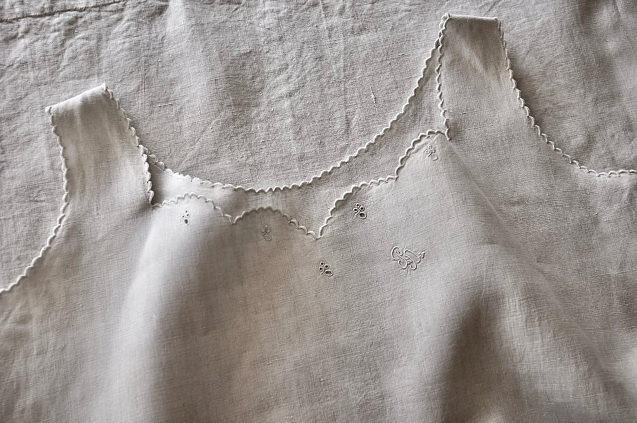 フランス 1900s リネン 空虚な花々の遊戯とモノグラムと肩ボタンワンピース アンティーク