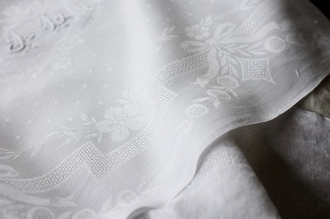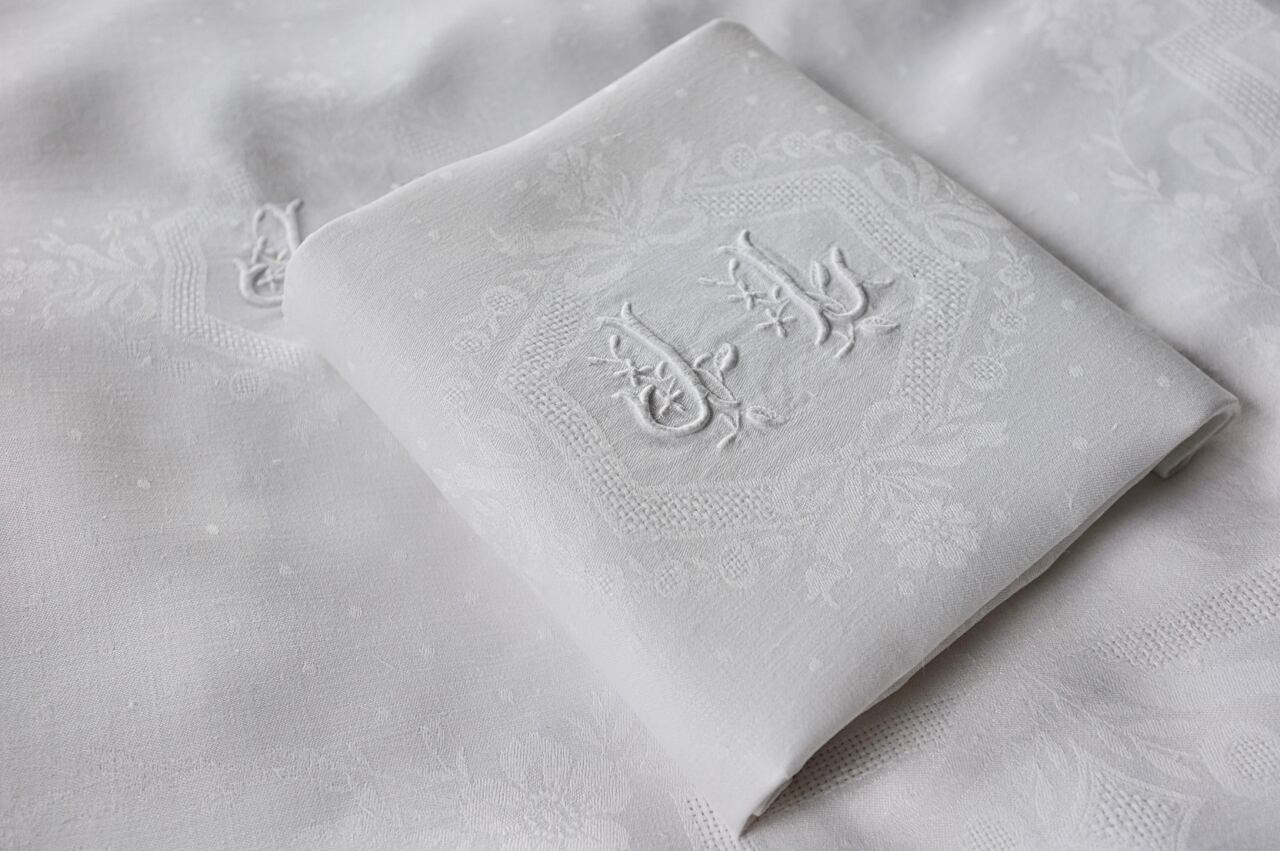 残1 フランス リネン 84c 白槿と白デイジーと白リボンによるモノグラムのあるナプキン アンティーク