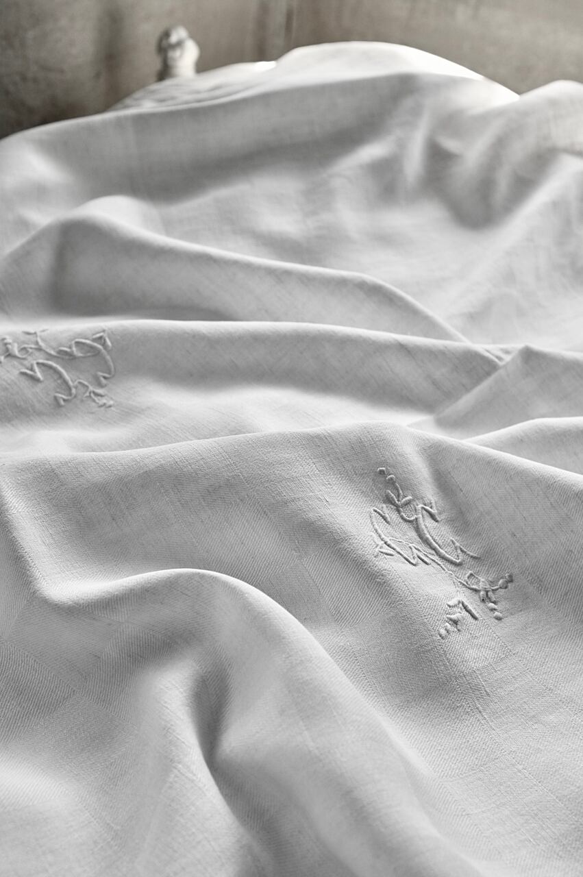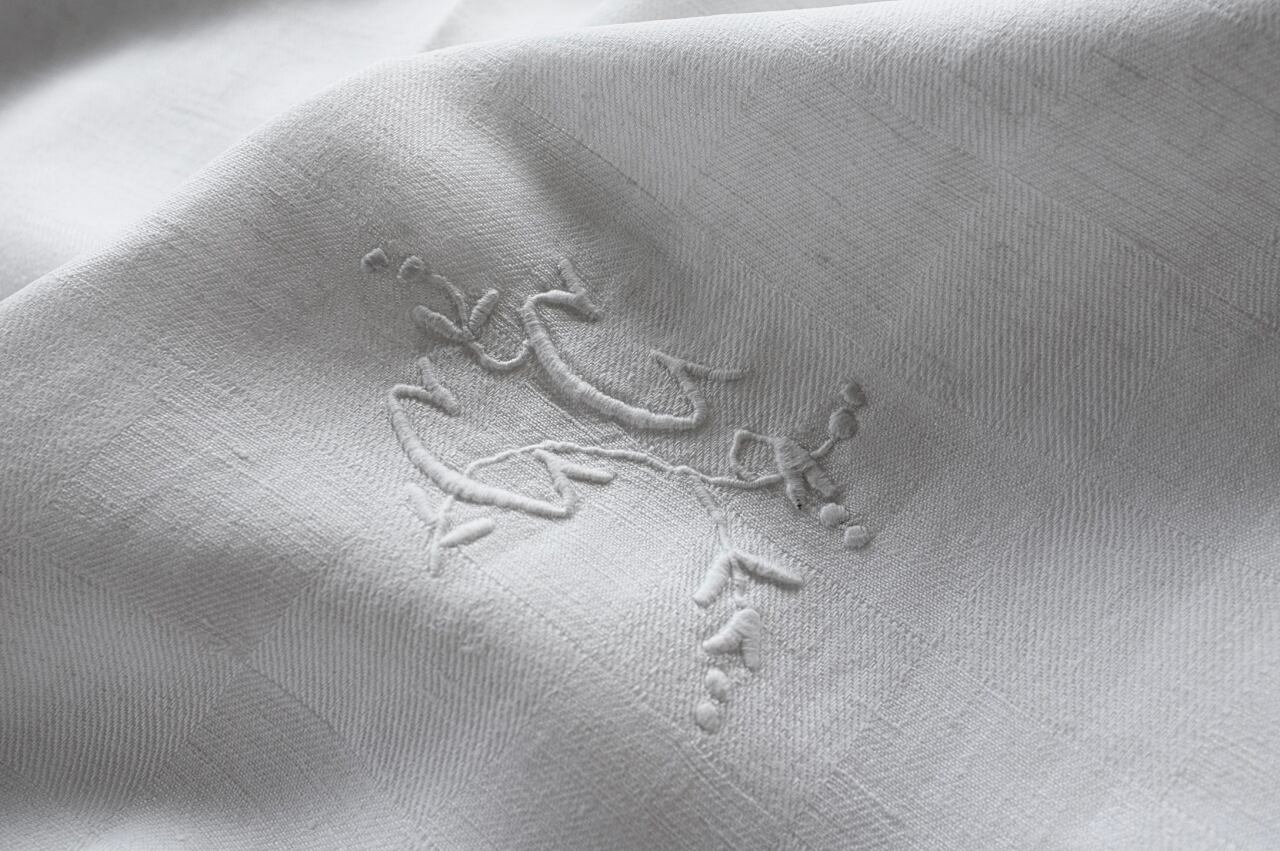 フランス リネン 180c 鏡の国のアリス的モノグラムとテーブルクロス アンティーク