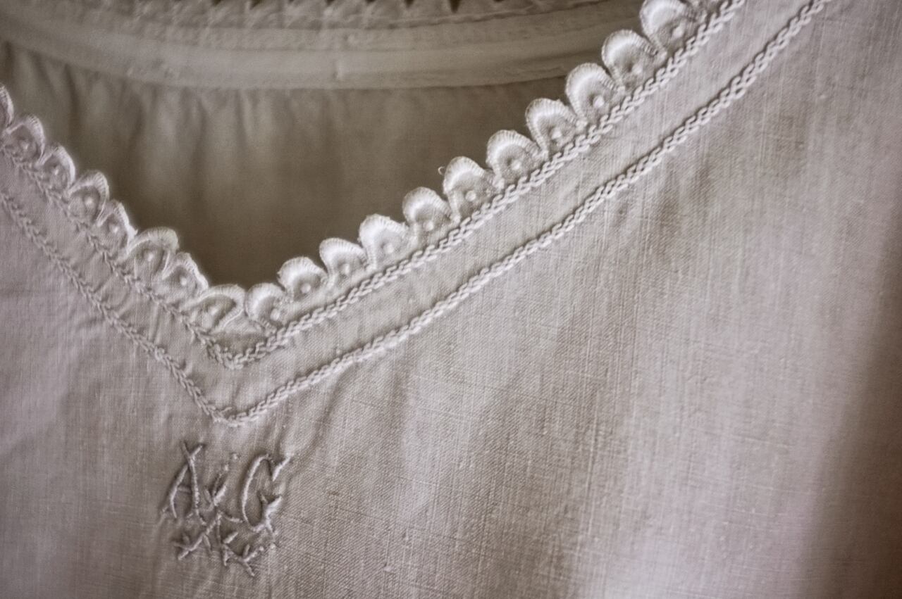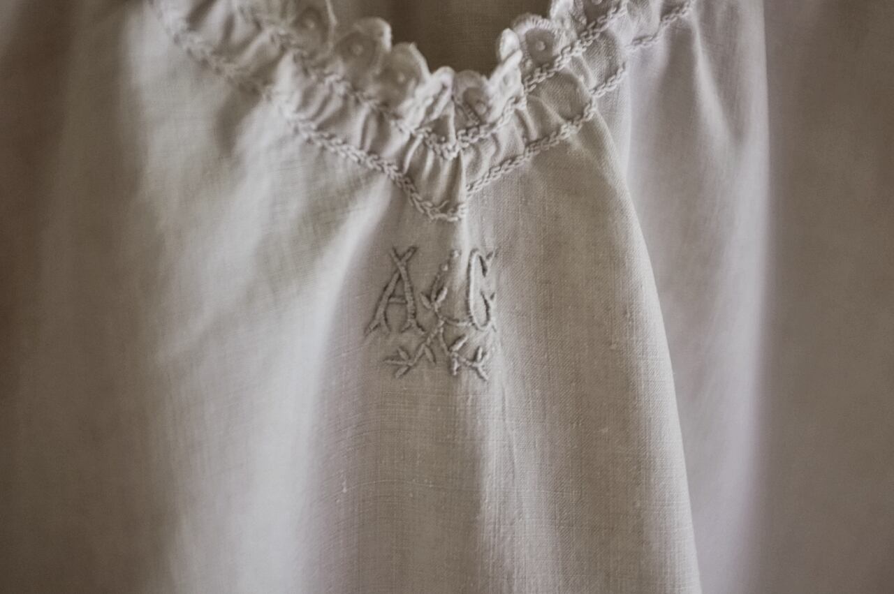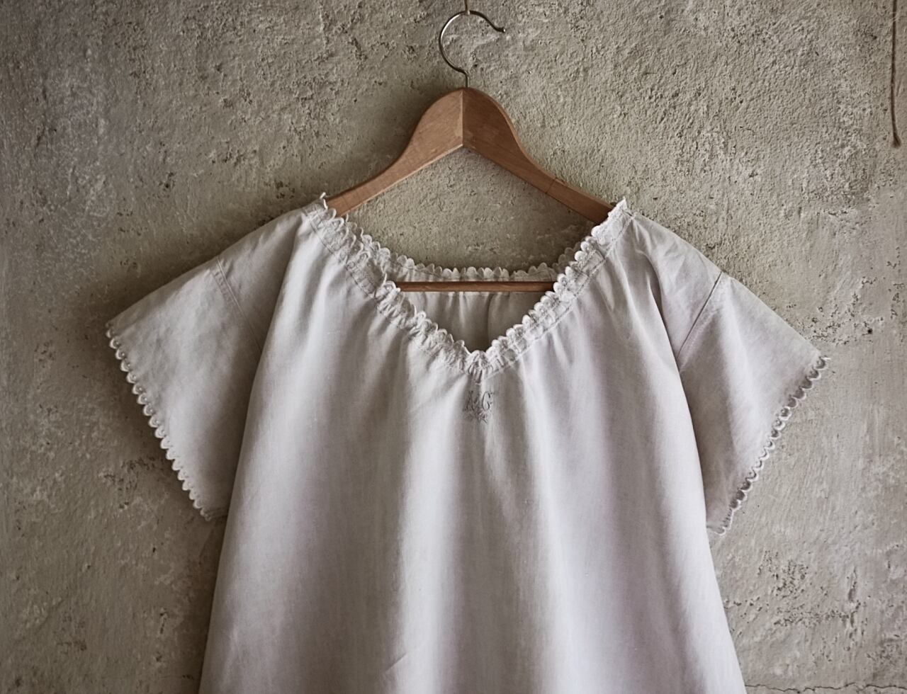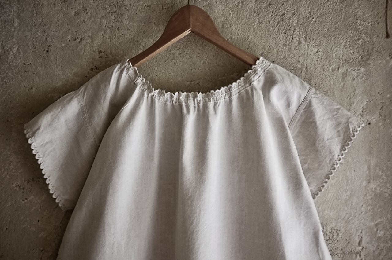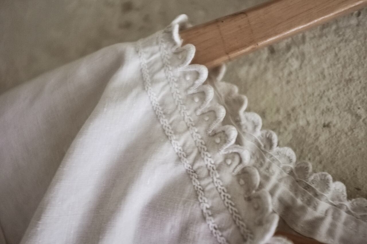 フランス 1900s リネン 真珠守りの貝たちととろりとしたギャザーワンピース アンティーク