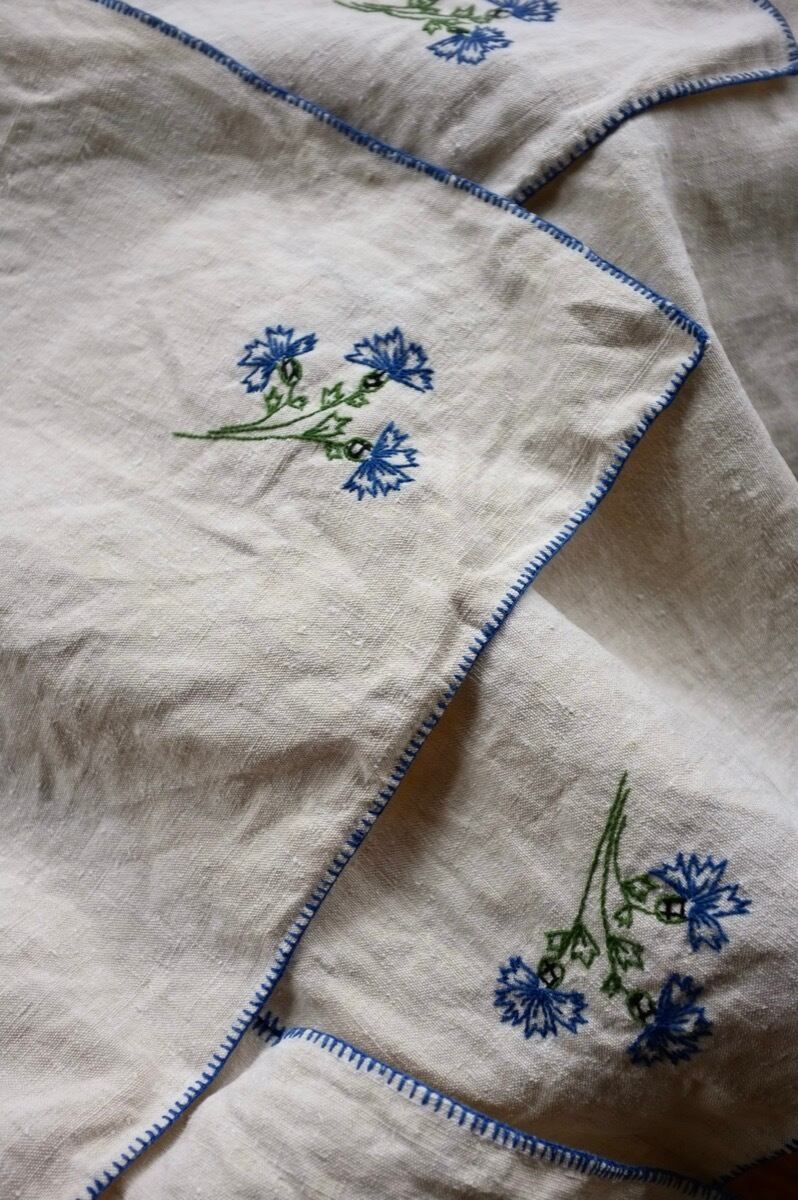 フランス 手織リネン bleuetとシャンブルリネンの刺繍クロス アンティーク