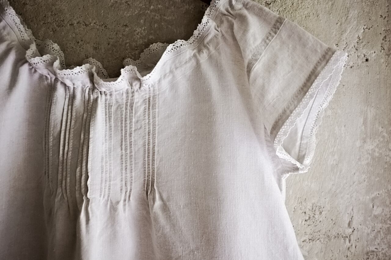 フランス 1900s リネン 小さなレースとピンタックとギャザーワンピースb アンティーク