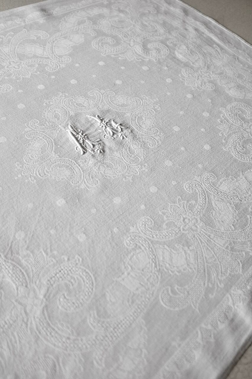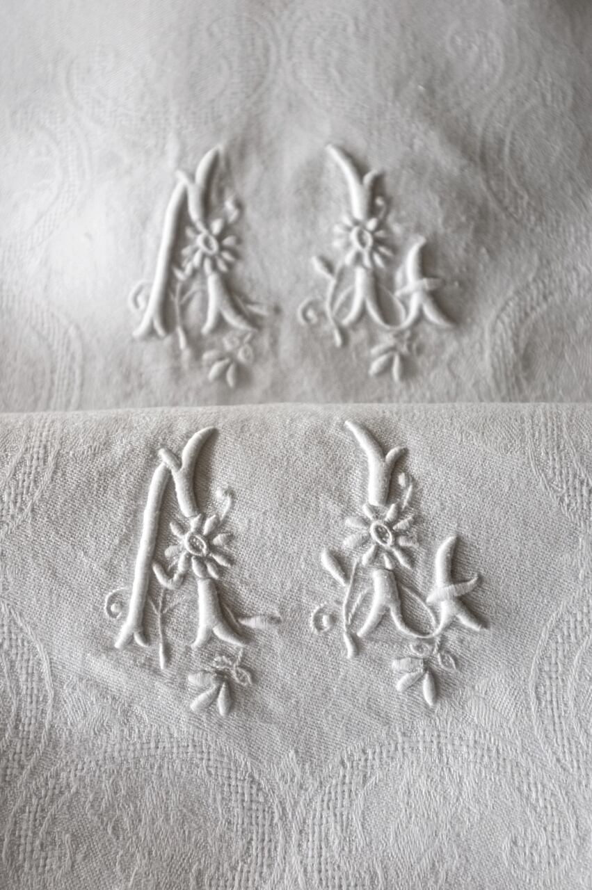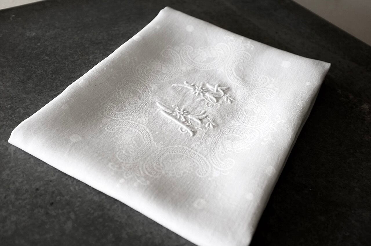 フランス リネン 時計草と永遠のリボンとモノグラムのあるナプキンセット アンティーク