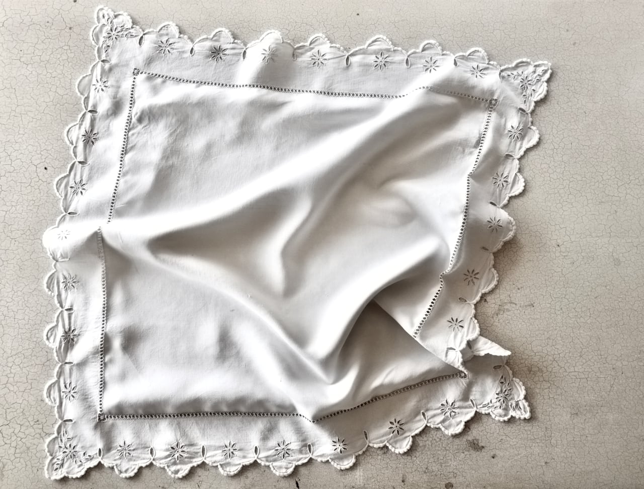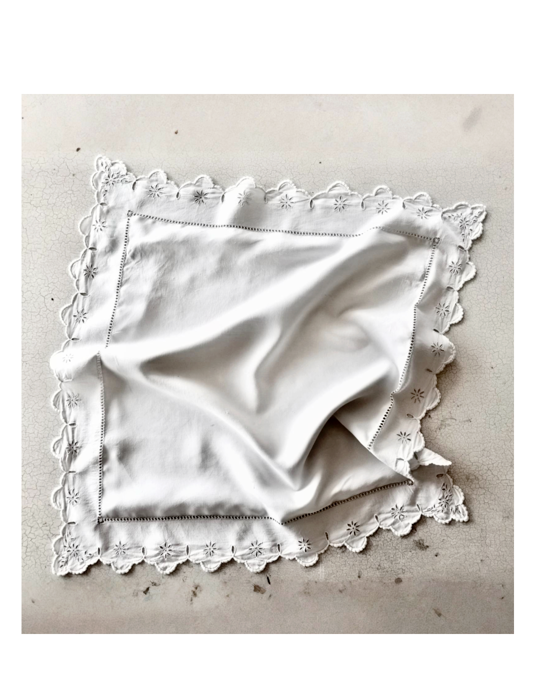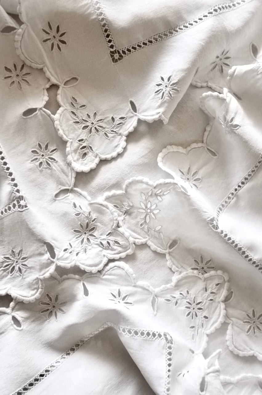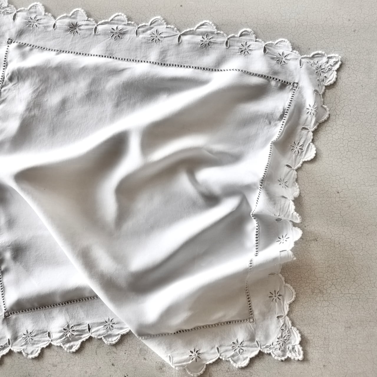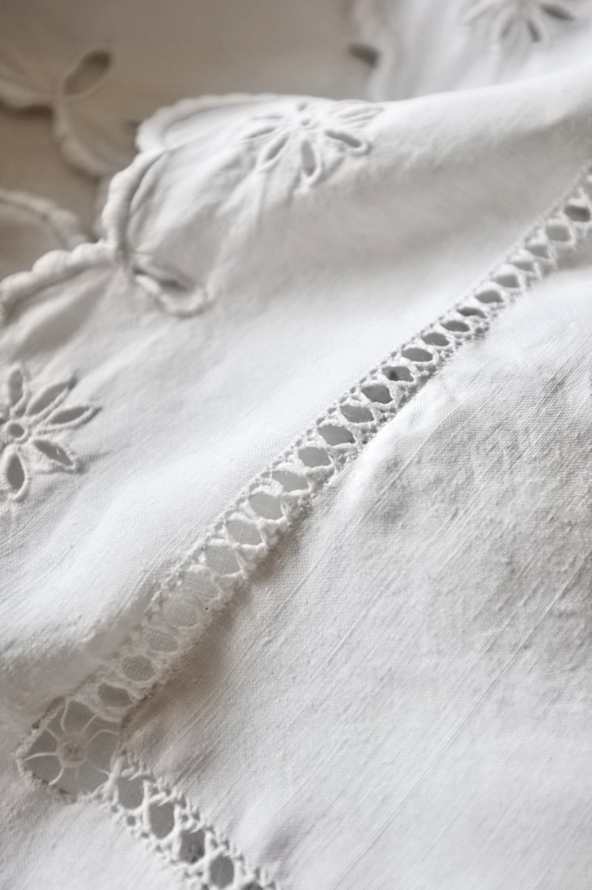 フランス 85c 空虚な球と白花ととろりとしたリネンのクッションカバー アンティーク