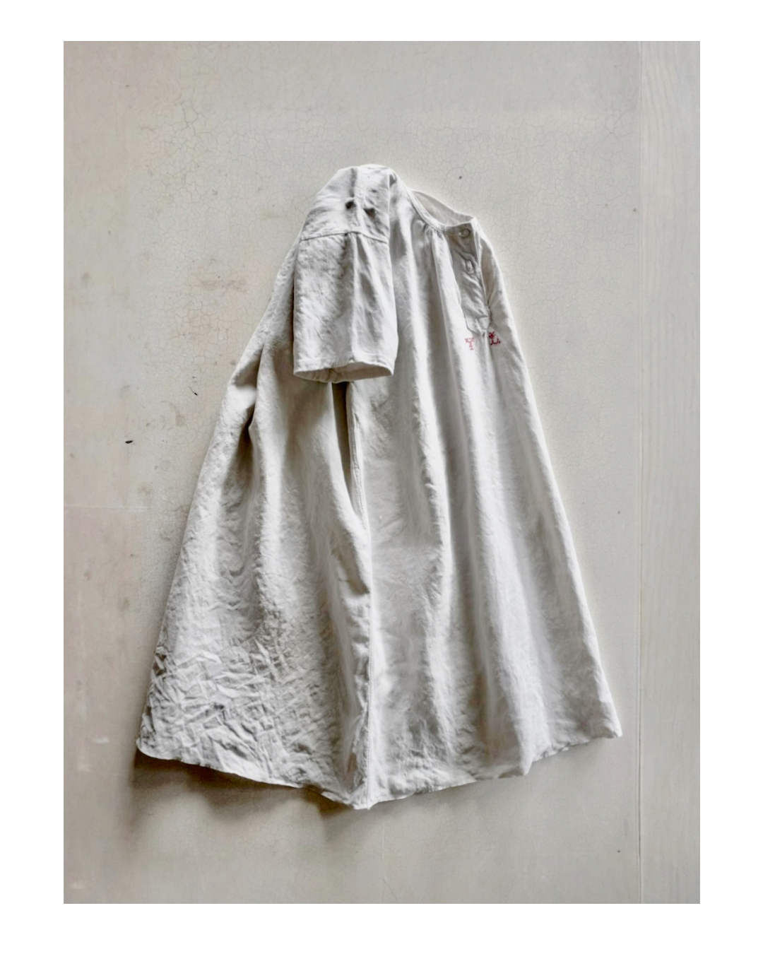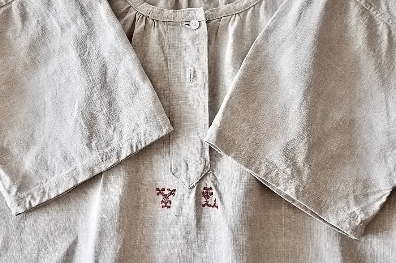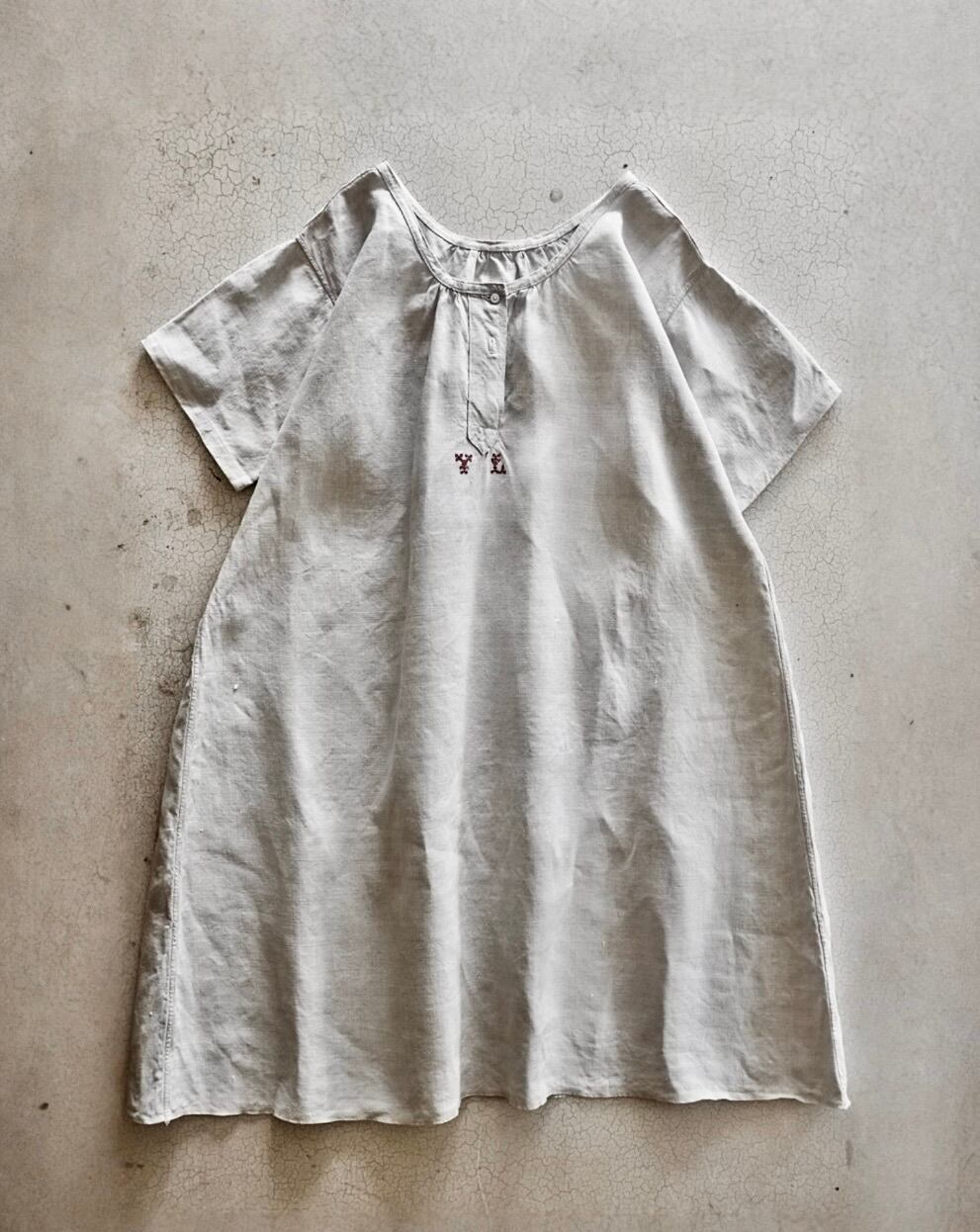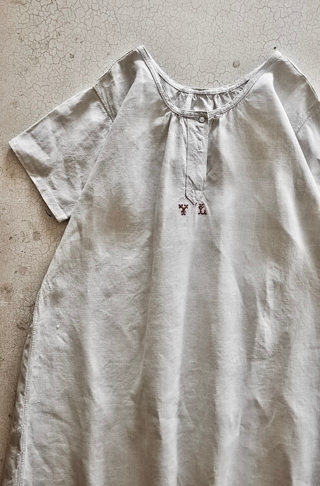 フランス 1900s 手織リネン 装飾的モノグラムと緩やかなワンピースa アンティーク