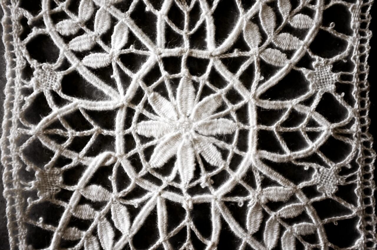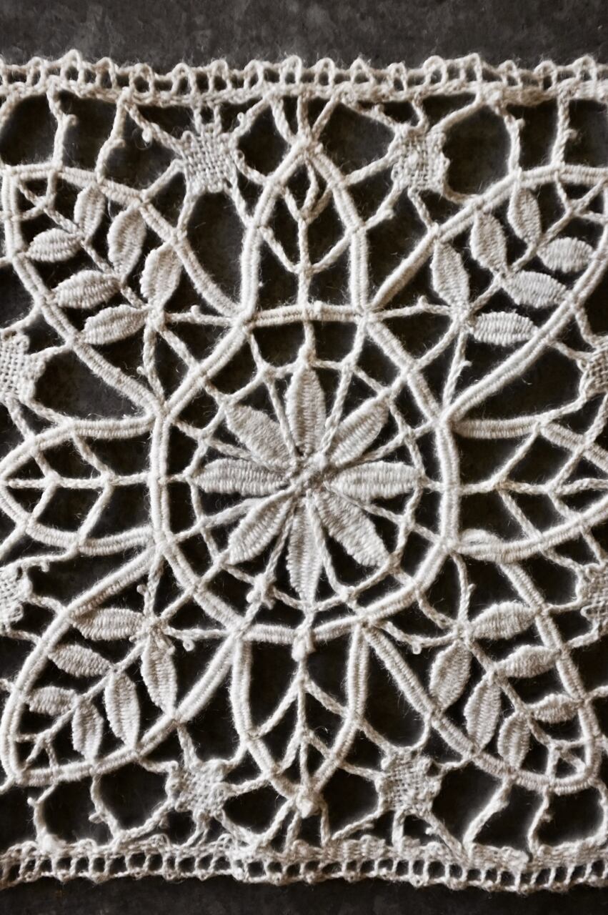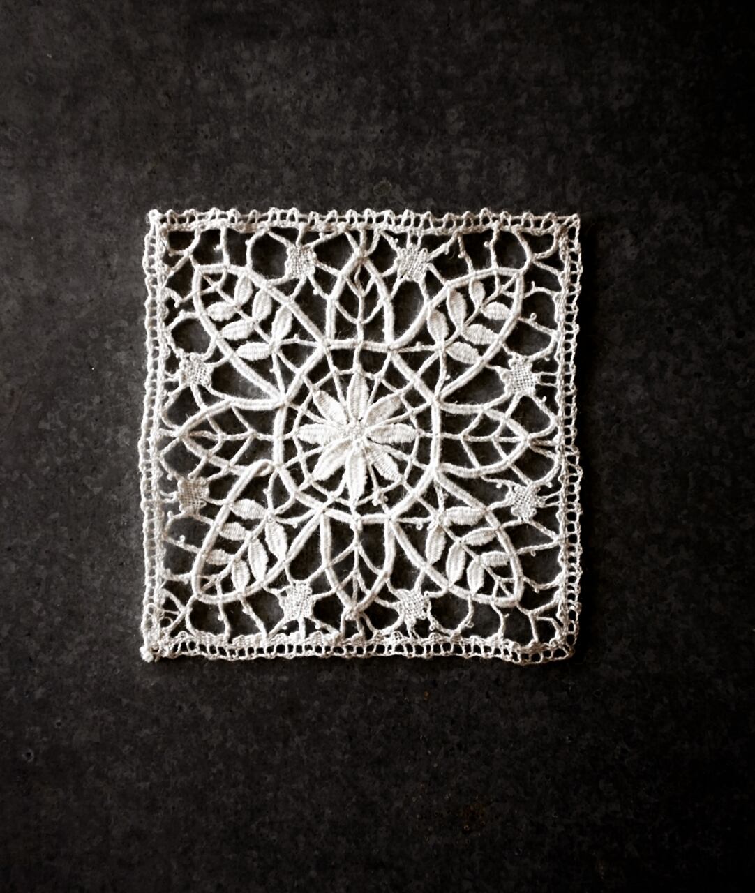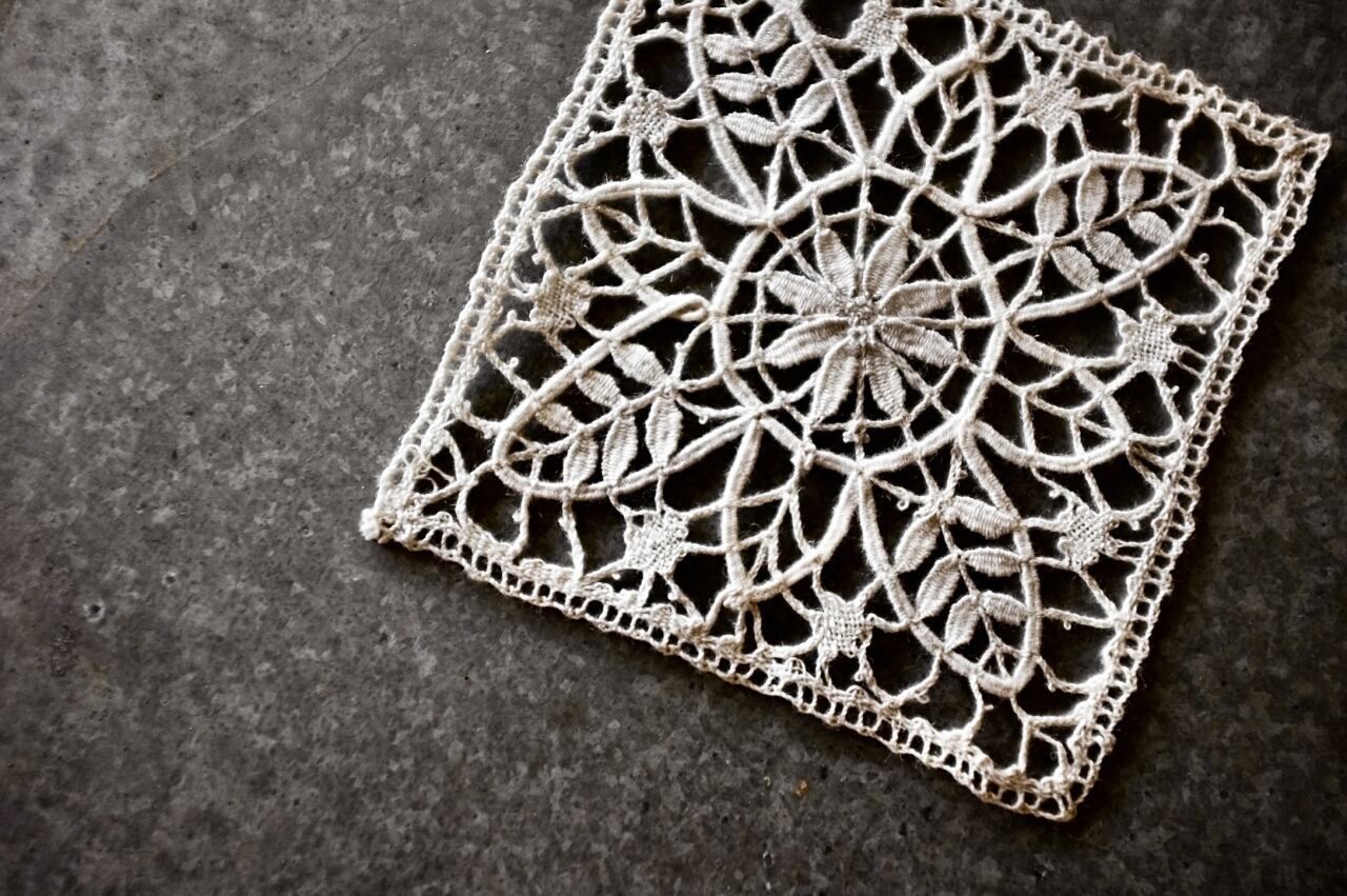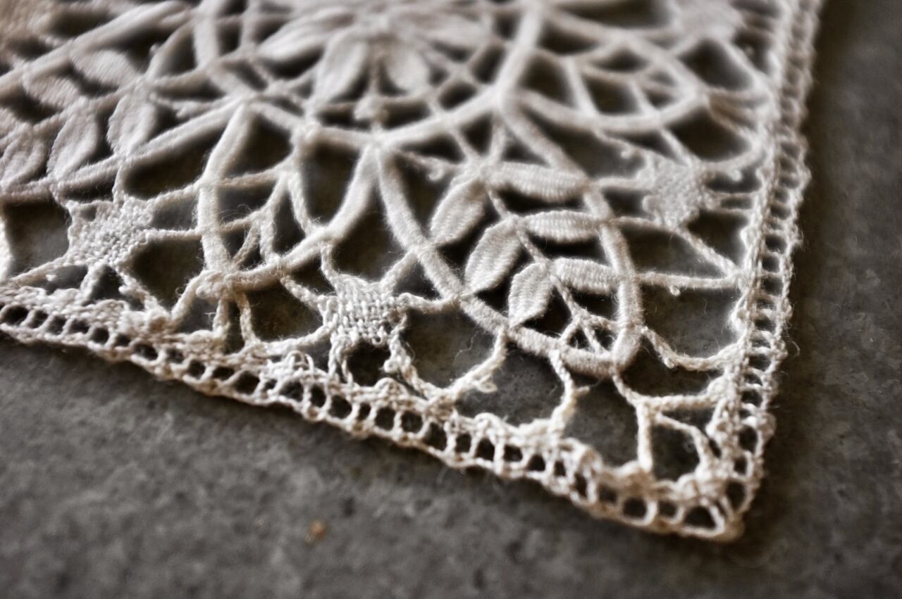 フランス リネン 万華鏡的植物たちのボビンレースドイリーb アンティーク