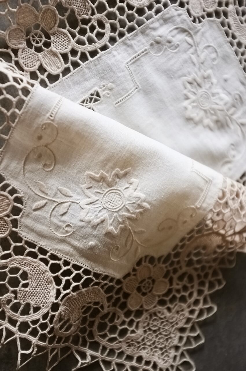 手刺繍手縫、リネン製、ハンドメイドの作品。