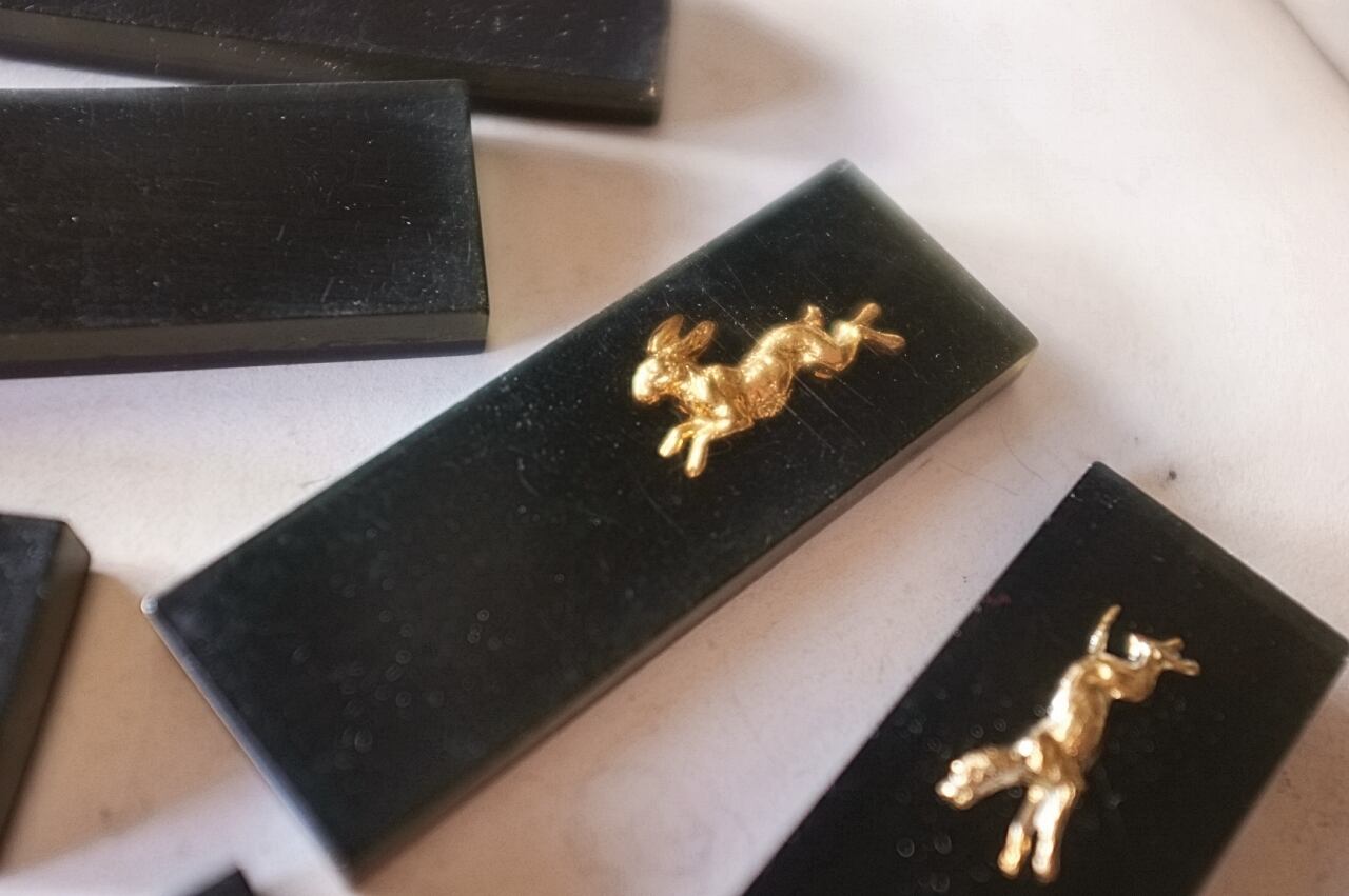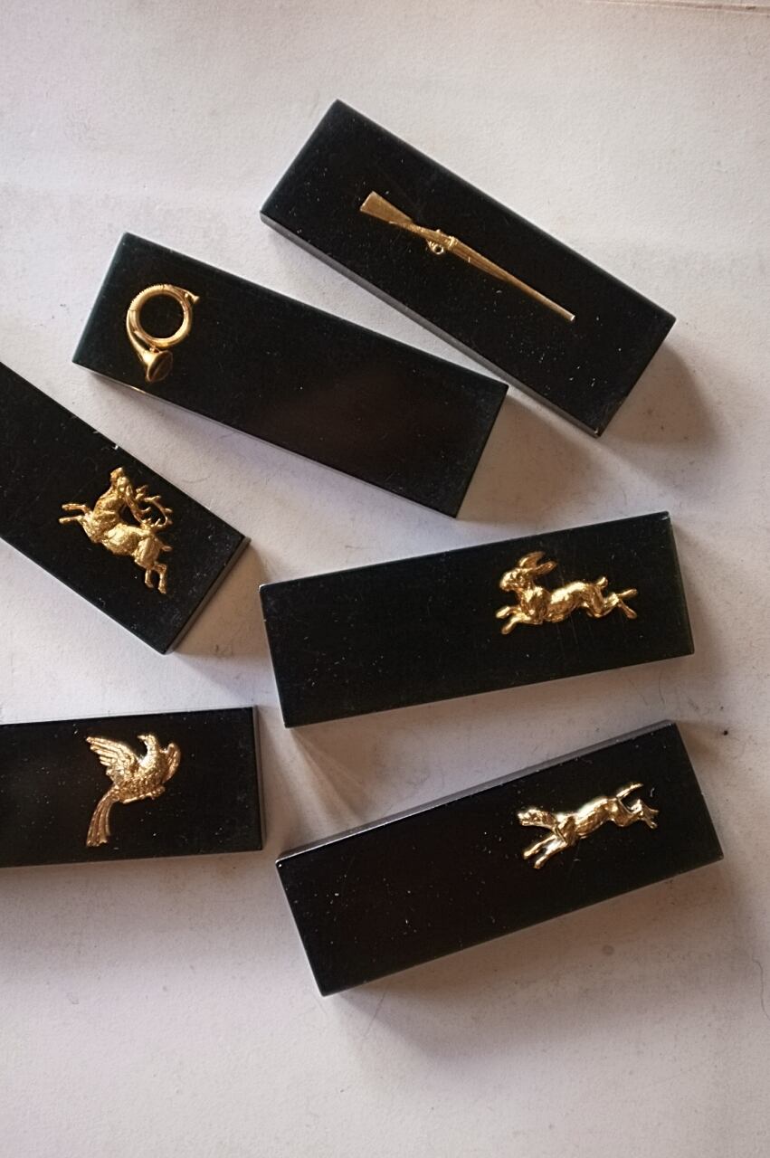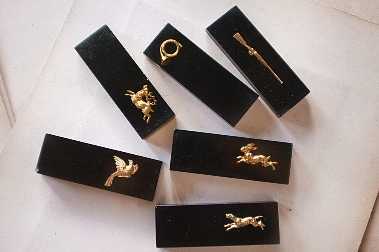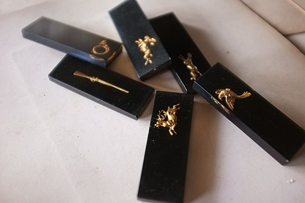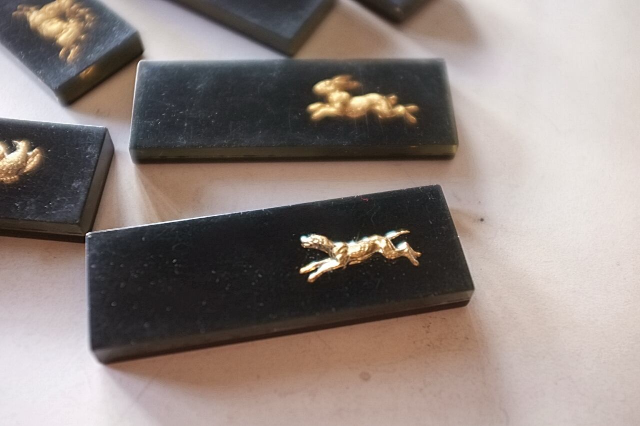 鉄砲と鳩に少し大きめ、牡鹿とウサギに小さな欠け。