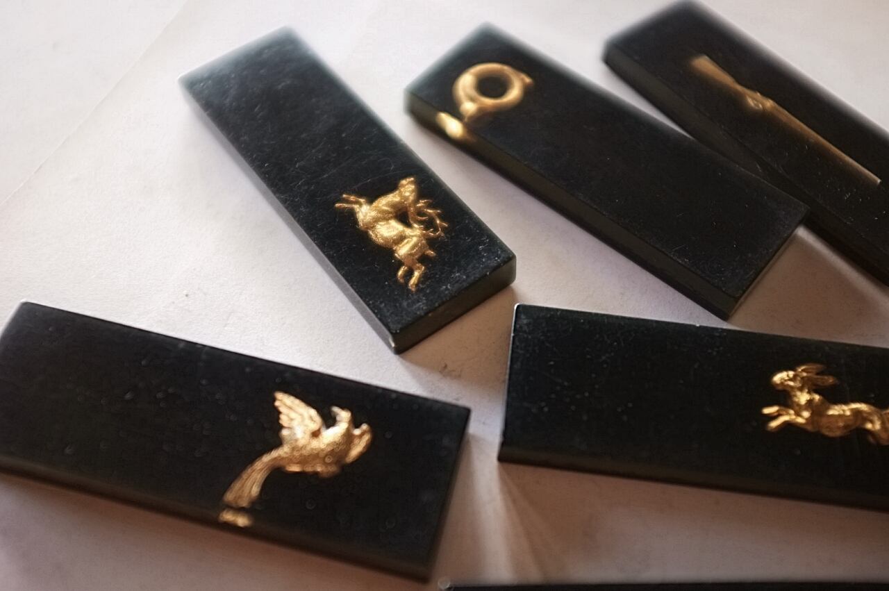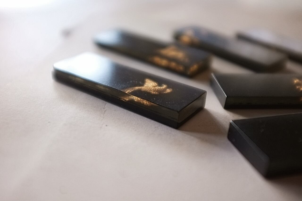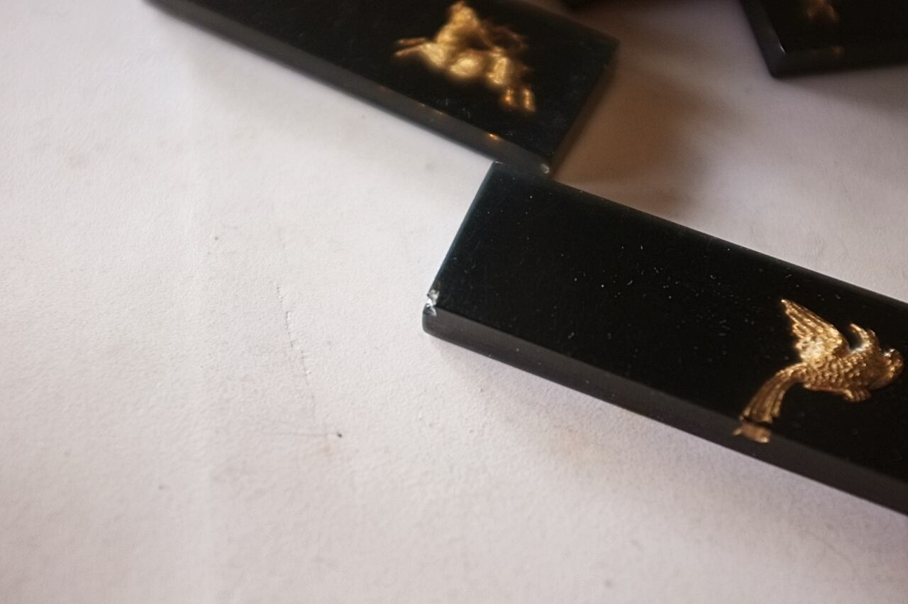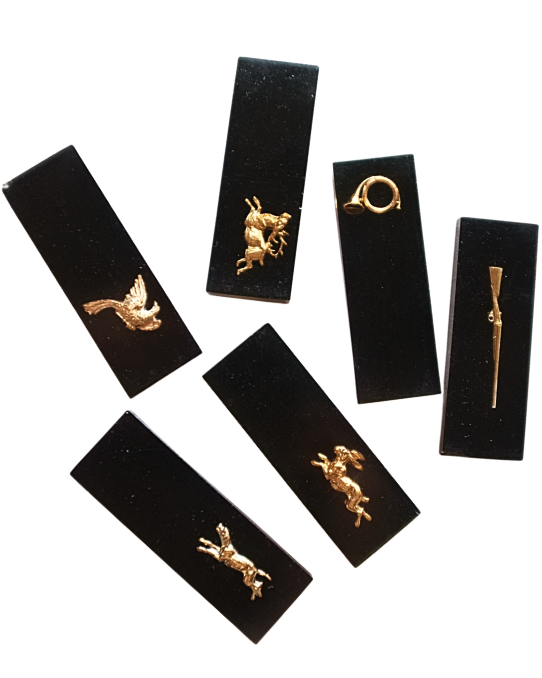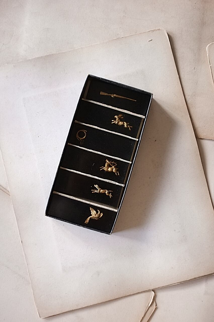 鉄砲と鳩に少し大きめ、牡鹿とウサギに小さな欠け。