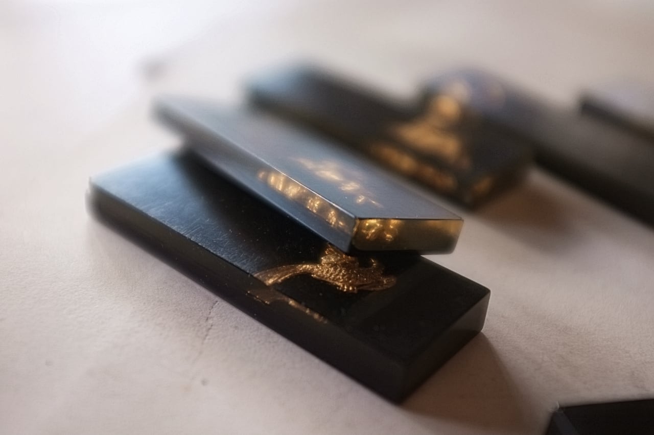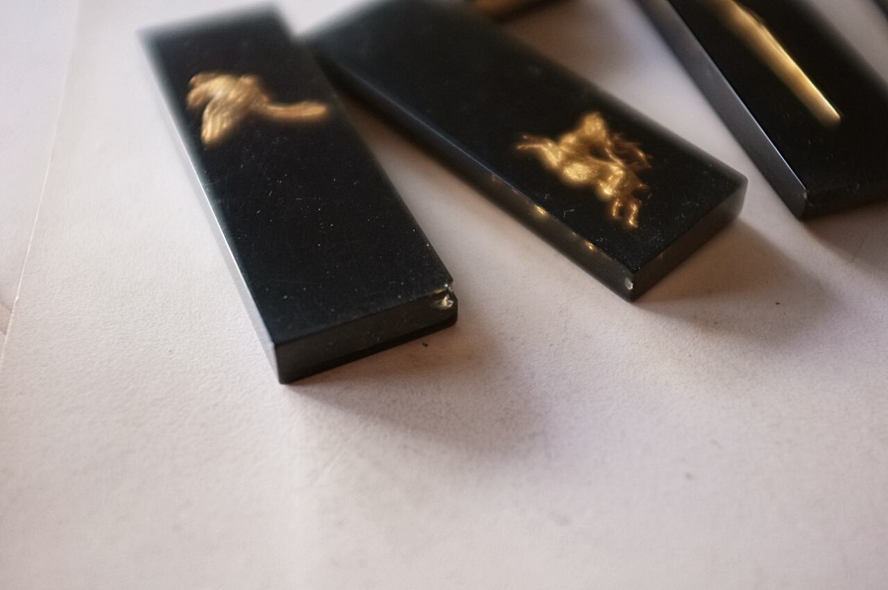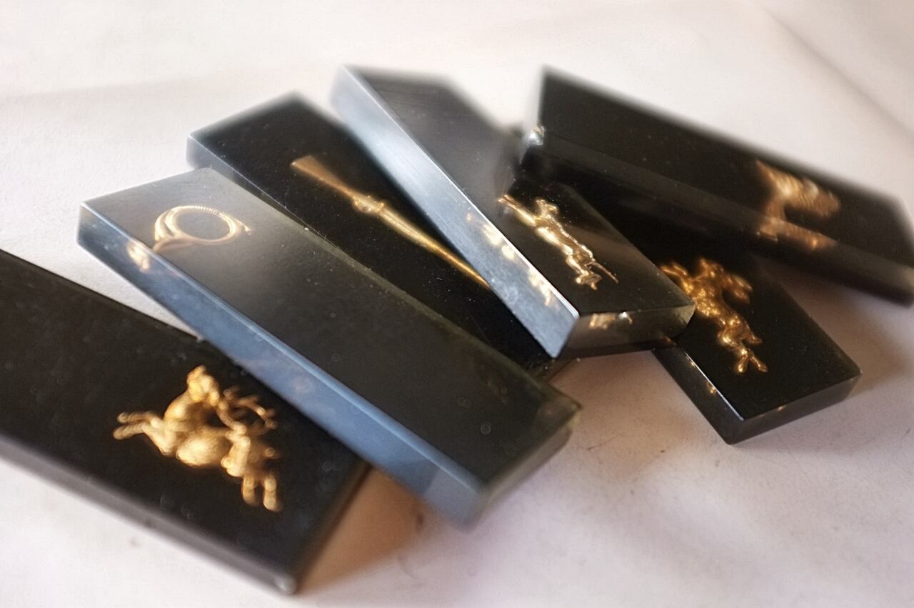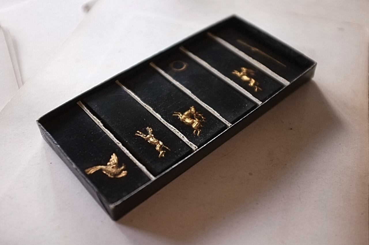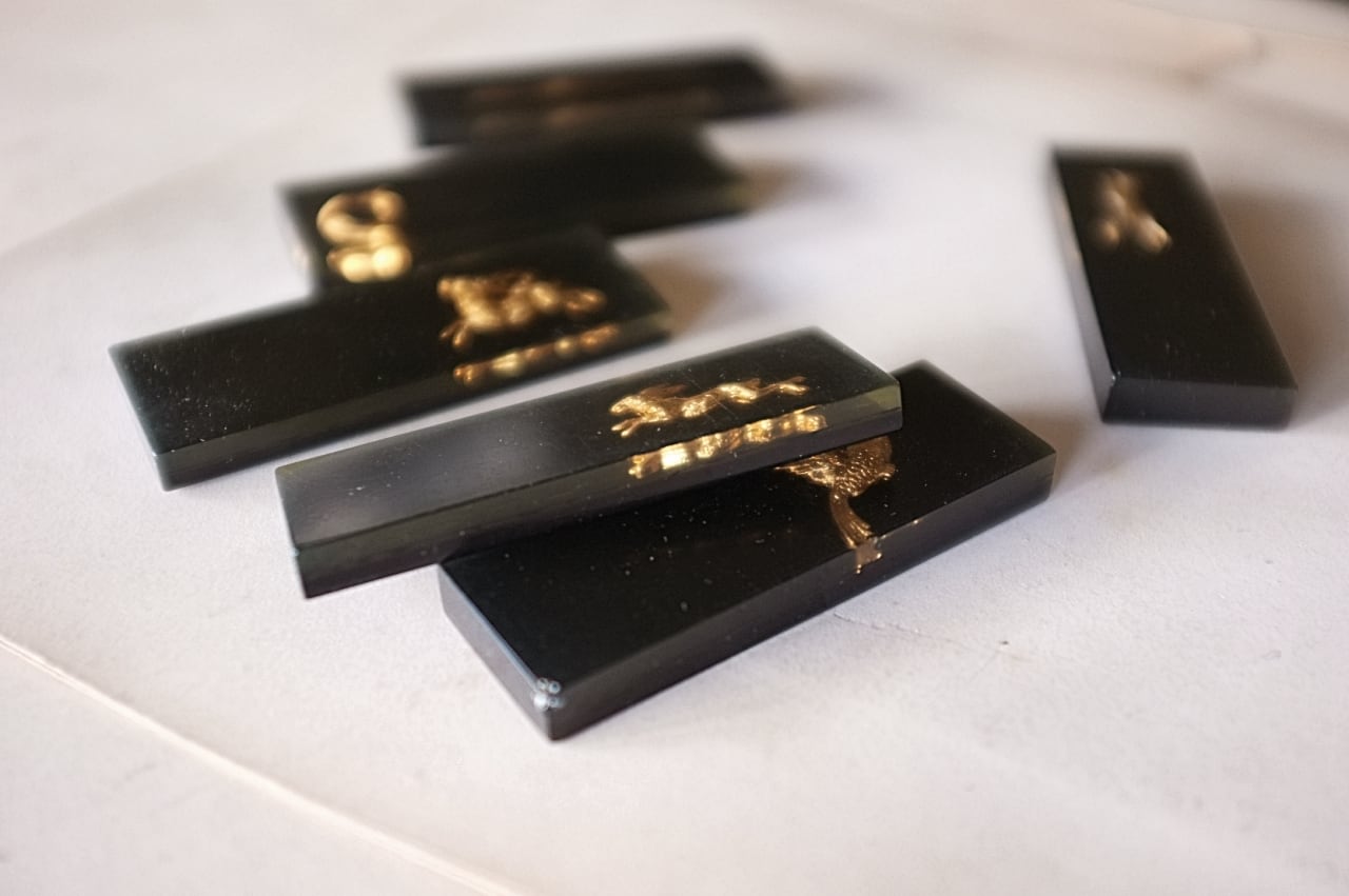 鉄砲と鳩に少し大きめ、牡鹿とウサギに小さな欠け。