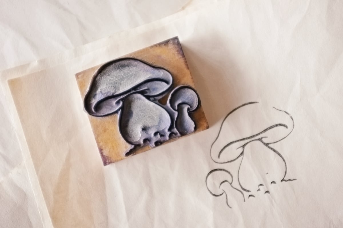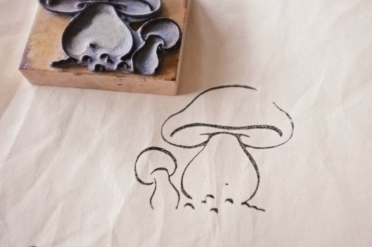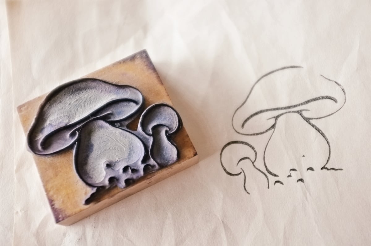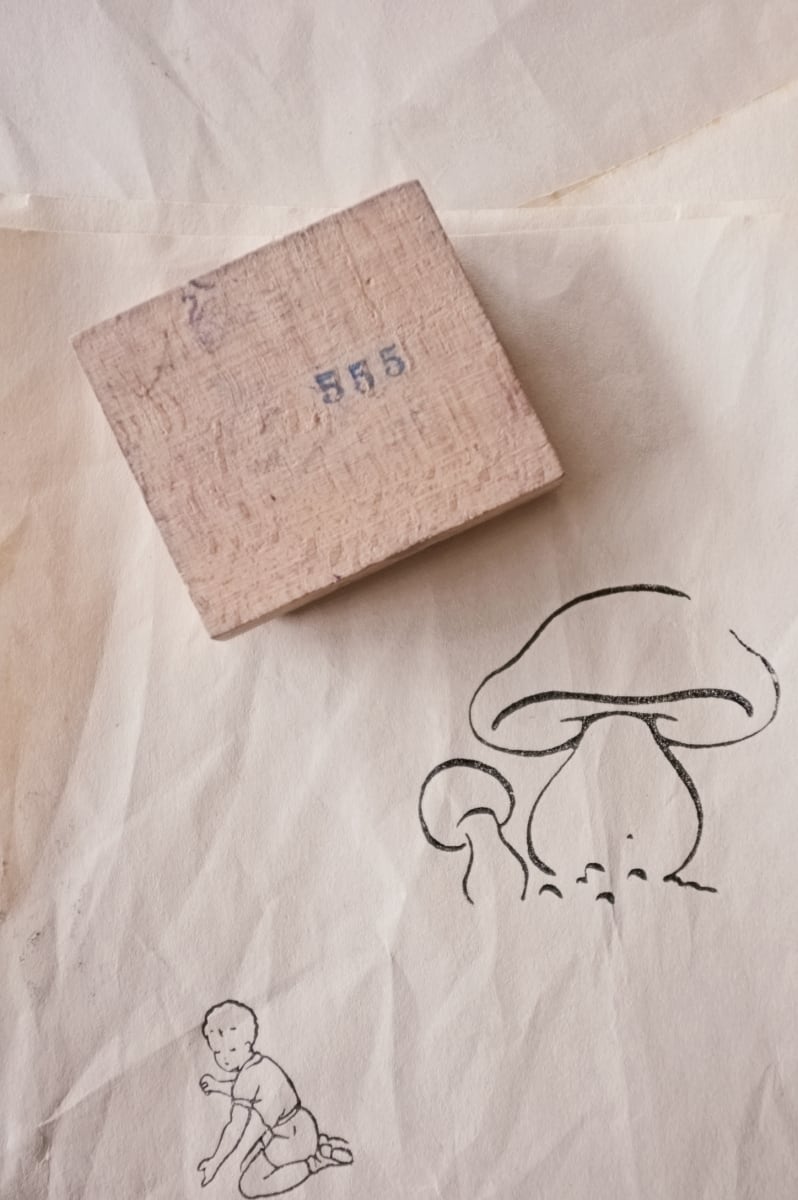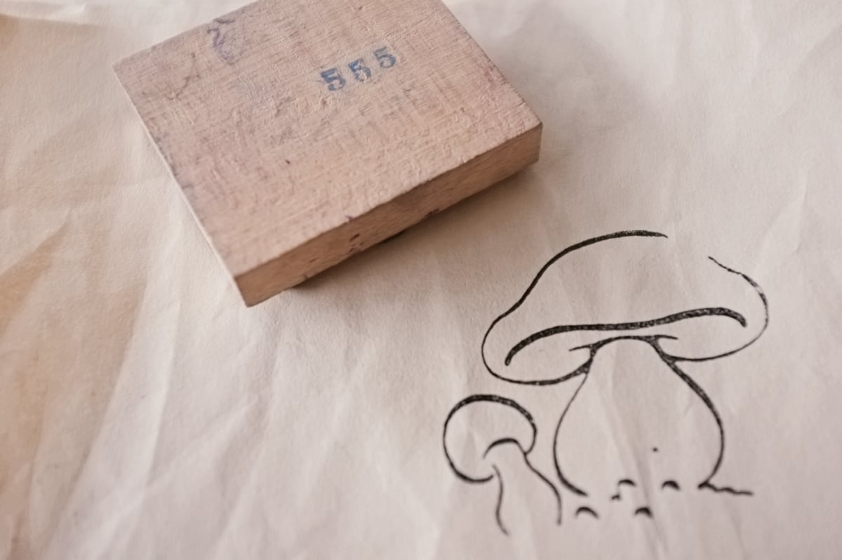 フランス 6.6c 平面のキノコとメランコリーな木製スタンプb ヴィンテージ