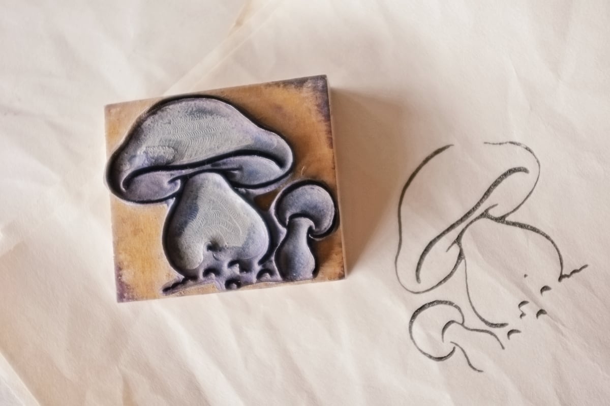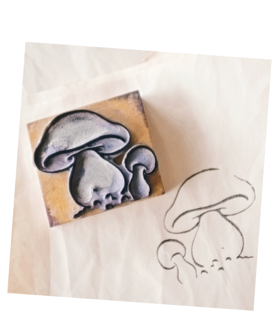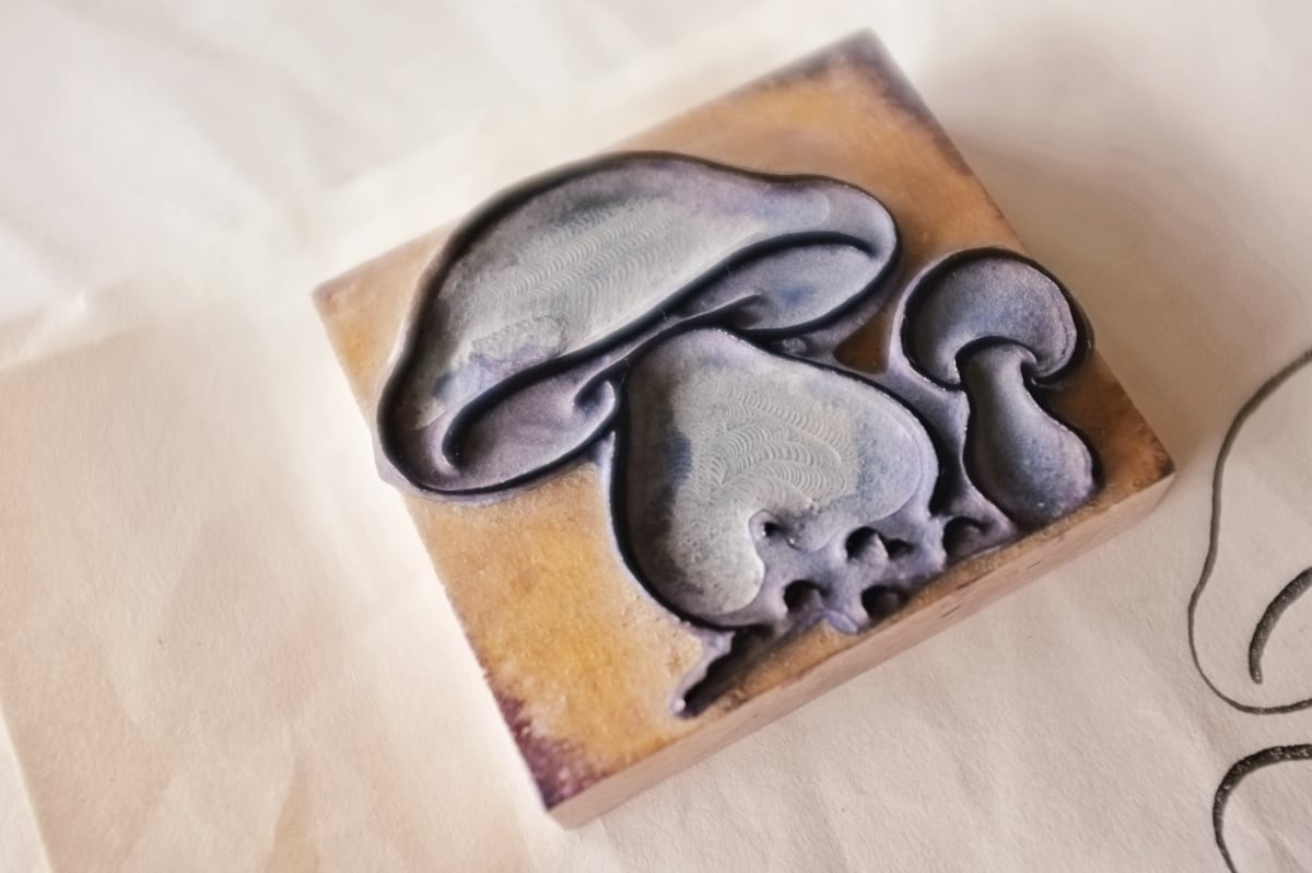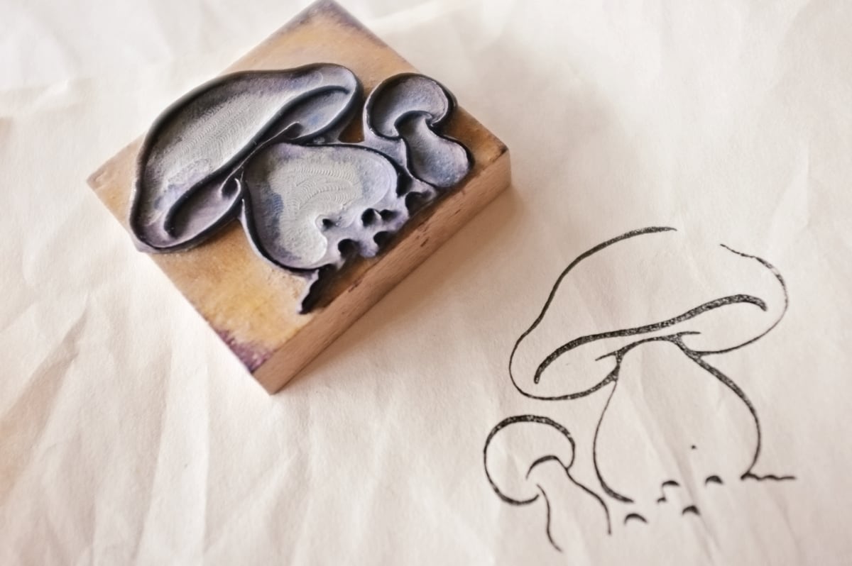 フランス 6.6c 平面のキノコとメランコリーな木製スタンプb ヴィンテージ