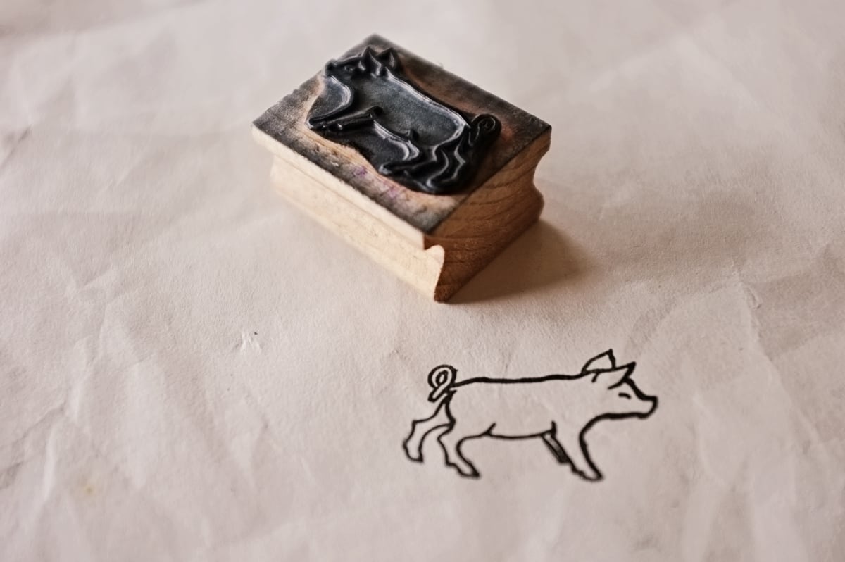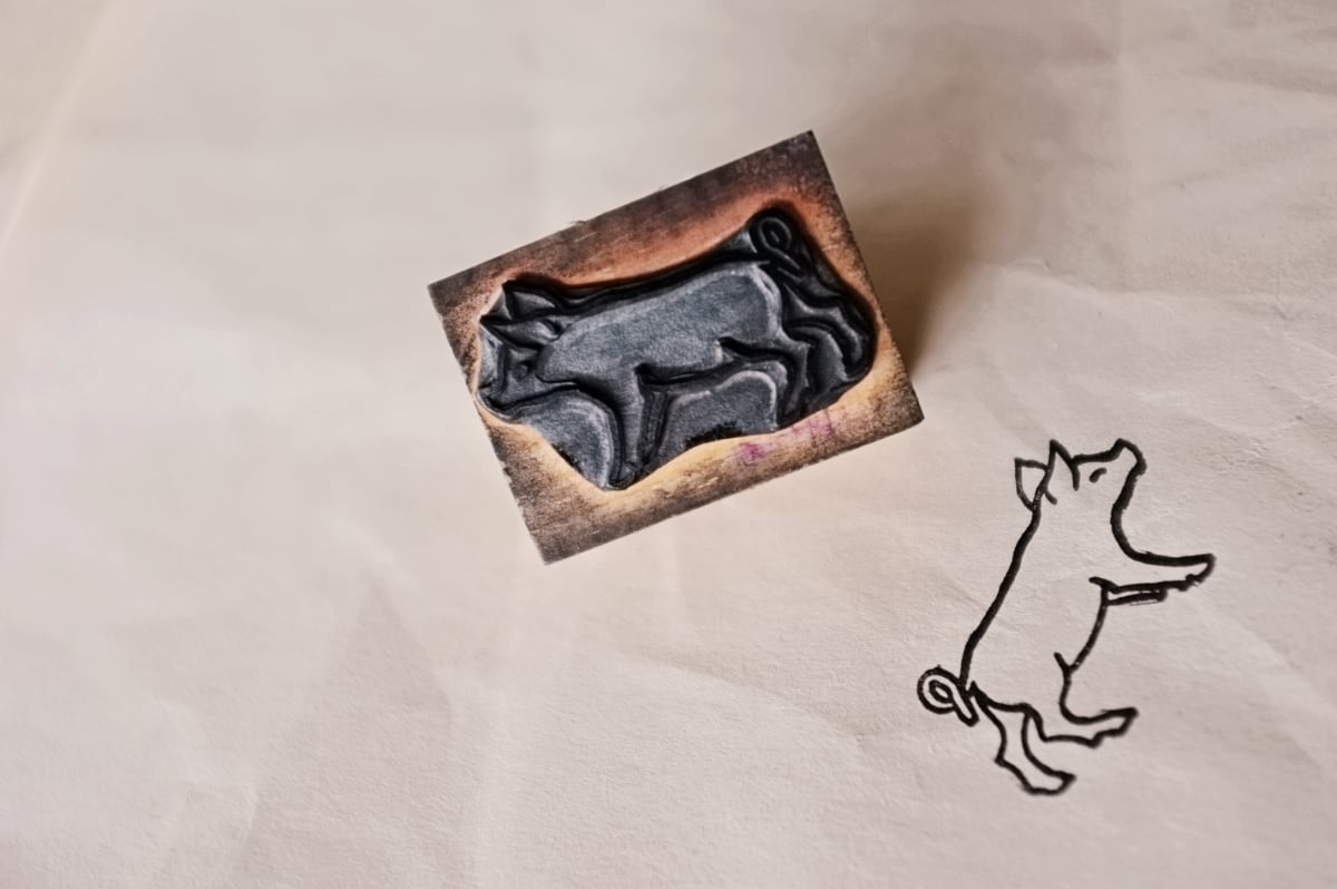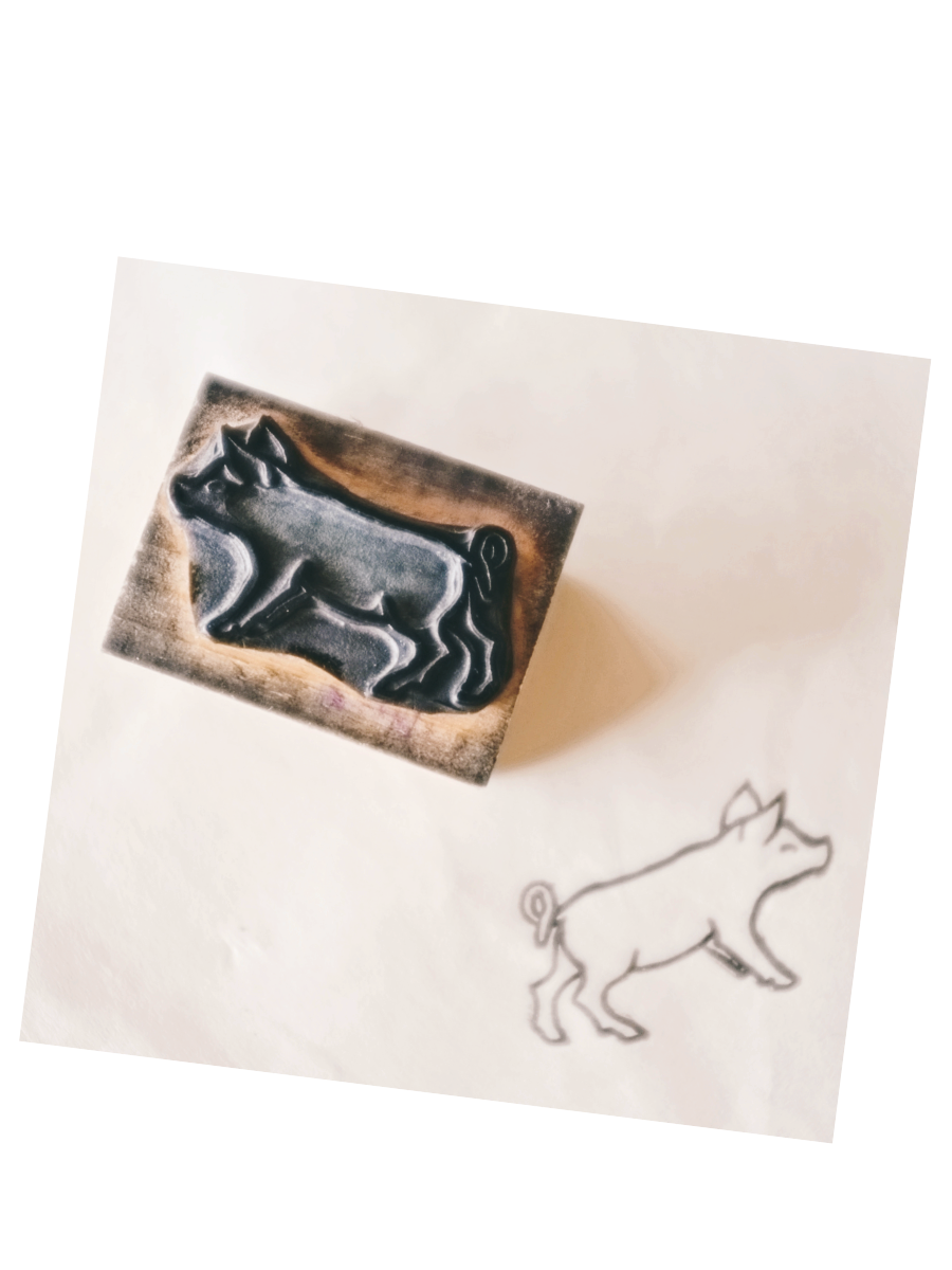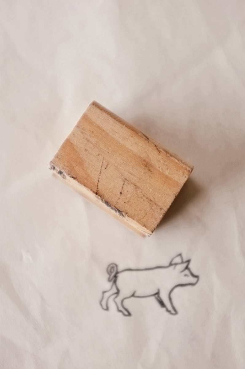フランス 4.5c 笑うこぶたさんとメランコリーな木製スタンプ ヴィンテージ
