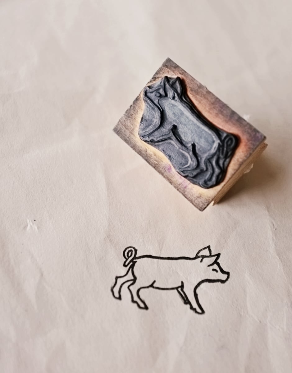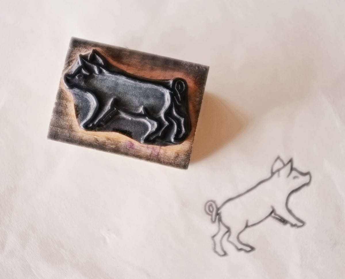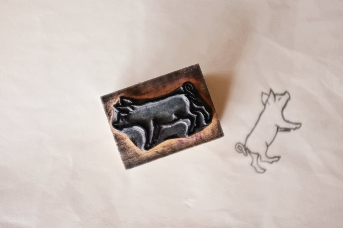 フランス 4.5c 笑うこぶたさんとメランコリーな木製スタンプ ヴィンテージ