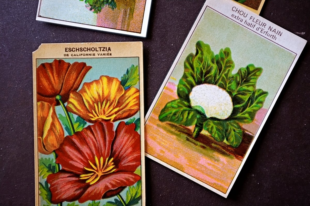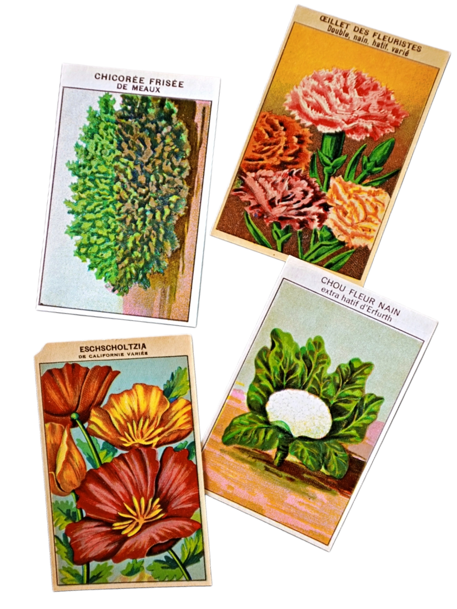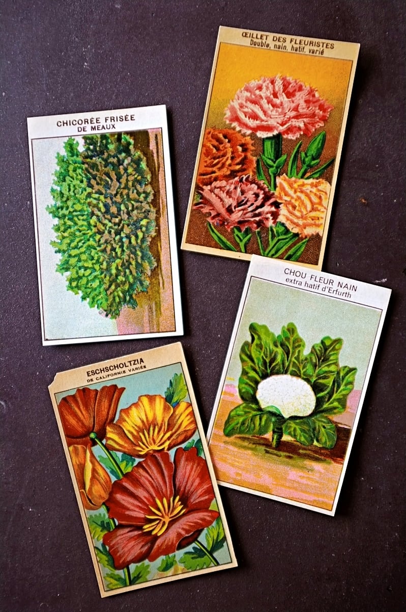 20s フランス 4set 膨満な花々と野菜たち 種子袋用ラベルd アンティーク