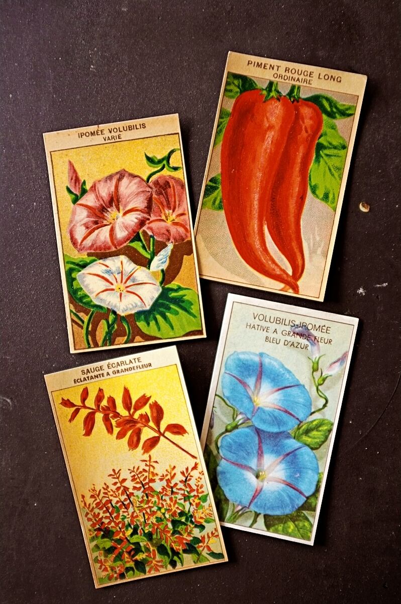 20s フランス 4set 膨満な花々と野菜たち 種子袋用ラベルn アンティーク