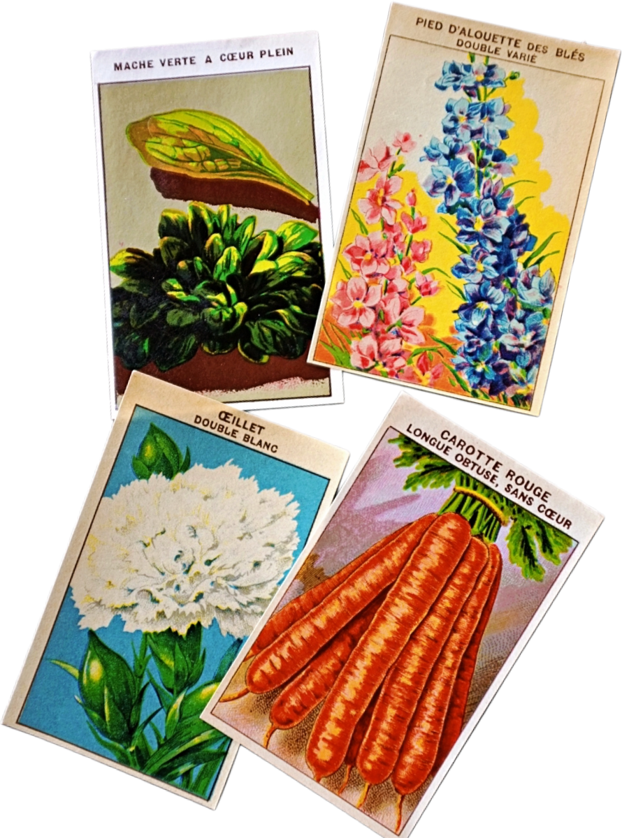 20s フランス 4set 膨満な花々と野菜たち 種子袋用ラベルw アンティーク
