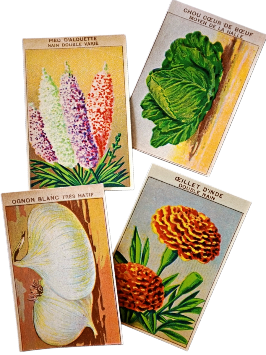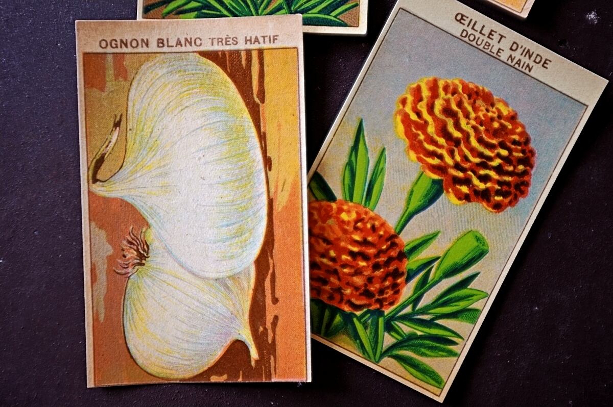 20s フランス 4set 膨満な花々と野菜たち 種子袋用ラベルx アンティーク