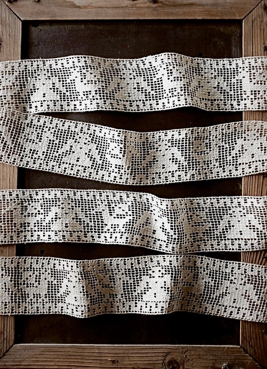 19世紀 フランス 100x6c リネン 少女とお馬とハンドワークフィレレース アンティーク
