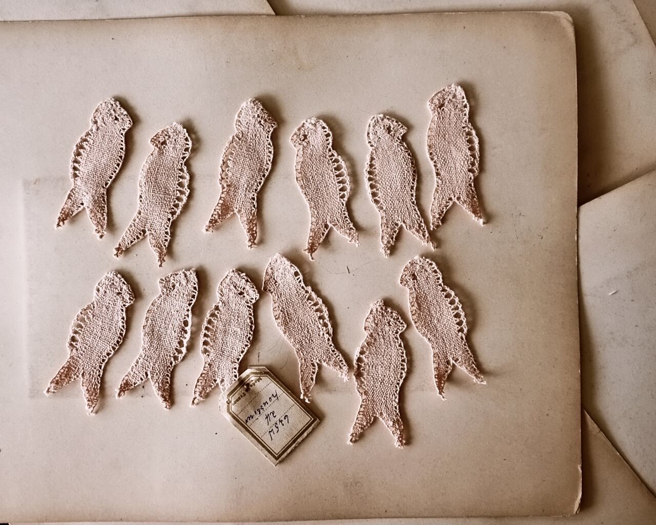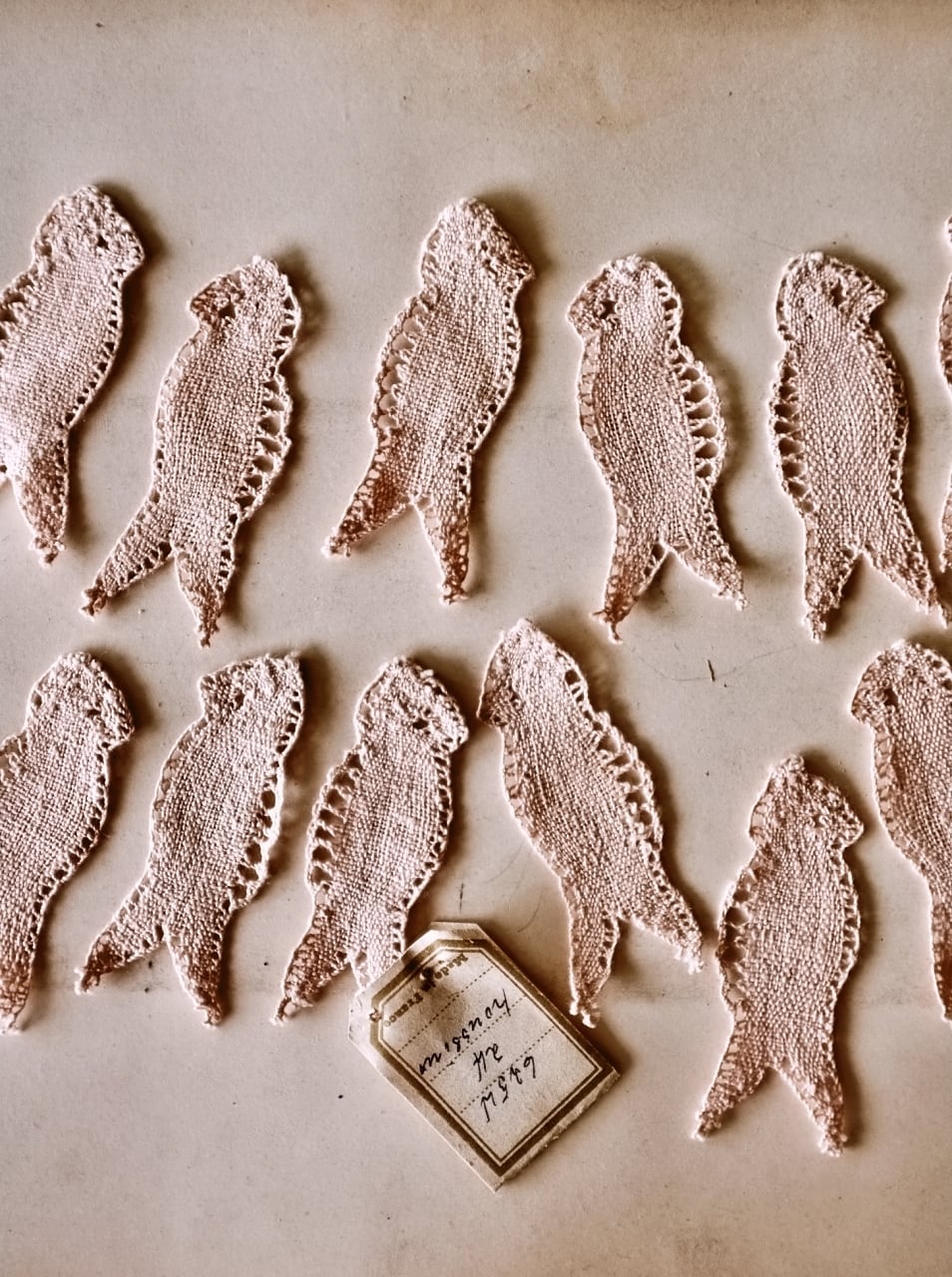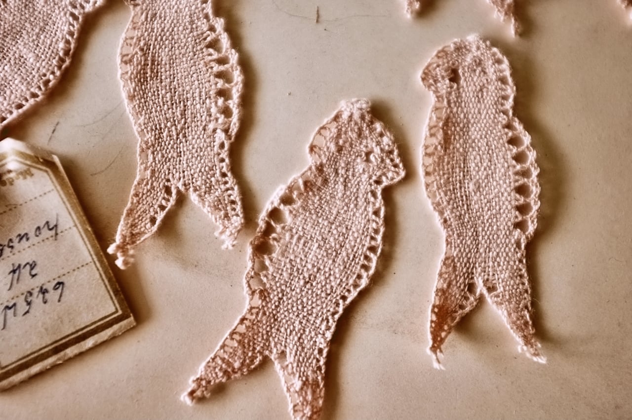 30s フランス リネン 古薔薇色のつばめとボビンレースアップリケ 2p アンティーク